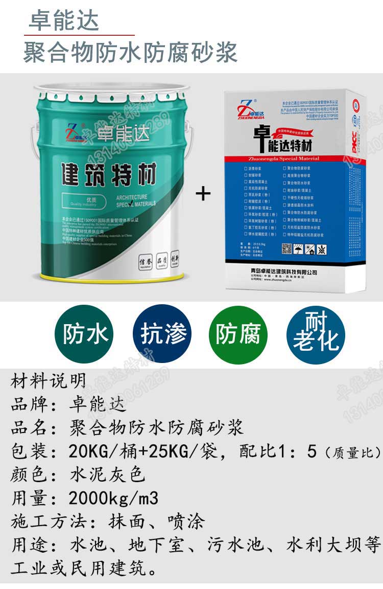 聚合物防水防腐砂漿由聚合物和無機粉料雙組分組成,是一種既具有高分子材料的粘接性,又具有無機材料耐久性的新型混凝土復合材料。具有抗老化耐酸堿的性能,一般用于有腐蝕性混凝土結(jié)構(gòu)的修補加固。
